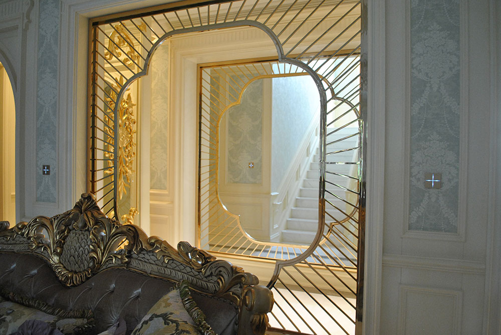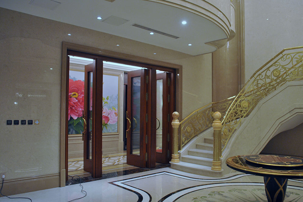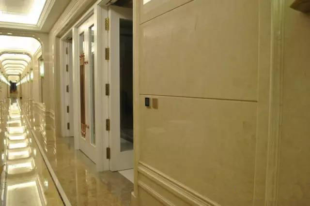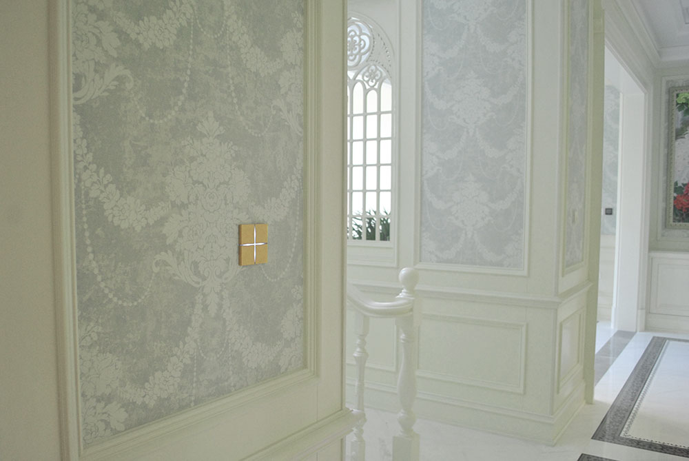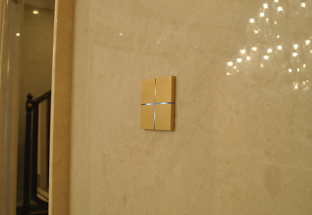 走进别墅,无处不是尤仆智能面板的身影,金色面板与室内装饰相呼应,让空间不再单调。墙面采用米黄色大理石瓷砖,富丽堂皇,结合灯光和地板上的深色条纹的点缀,使得整体空间大气又不失亮点。