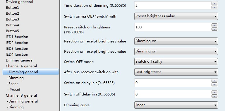 选项为 “Dimming on” 时, “switch” 调光时间由参数 “Time duration for dimming ( 0..65535 ) ” 设定。