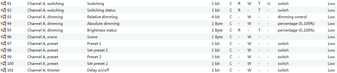 这是预设值 1 的通讯对象,通过这个通讯对象可以调用设置的预设值,接收到逻辑值为 “0” 的报文时,调光器开启的亮度由参数 “brightness value at obj=0” 决定,接收到逻辑值为 “1” 的报文时,亮度由参数 “brightness value at obj=1” 决定。 这个通讯对象在 preset1 激活后才被启用。 |