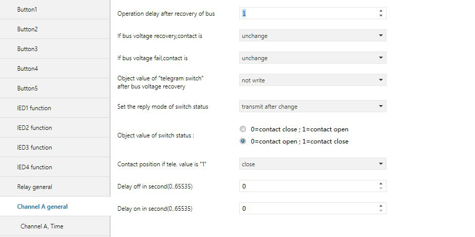 “Channel X general”参数设置界面如图 5.10 所示。该界面的设置作用于继电器的整个通道。在下面的介绍中”Channel X”中”X”“代表的是继电器的一路输出。继电器的每一路都具有相同的参数设置界面和通讯对象,以下用其中一路做说明。