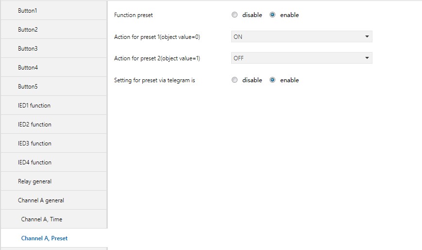 此参数用来设置是否允许通过总线修改预设值。当选择 “enable” 即为允许通过总线修改预设值,同时通讯对象 “Set preset 1/2” 被使能。通讯对象 “Set preset 1/2” 被用来把当前的开关状态保存为新的预设值。当其收到了报文 “0” 时,当前开关的状态值被保存为新的预设 1 ( preset 1 );当其收到了报文 “1” 时,当前开关的状态值被保存为新的预设 2 ( preset 2 )。当参数 “Actionfor preset 1 (object value 0)” 选择 “None” 及参数 “Action for preset2 (object value 1)” 选择 “Lastvalue of channel” 或 “restore parameterized value ofpreset 1” 时,新的预设值也同样会被保存为当前的状态 (ON/OFF) 。