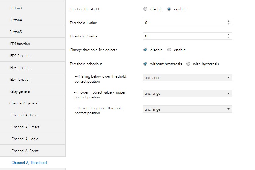 这三个参数在参数 “Thresholdbehavior” 设置成 “without hysteresis” 时可见。它们设定收到通讯对象 ―Threshold input‖ 的值时继电器的开关动作。